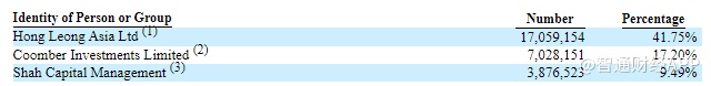 根据2020年2月12日公布的13D文件,Coomber Investments Limited持有7,028,151股普通股,持股比例为17.2%;Shah Capital Management持有3,876,523股普通股,持股比例为9.49%。
