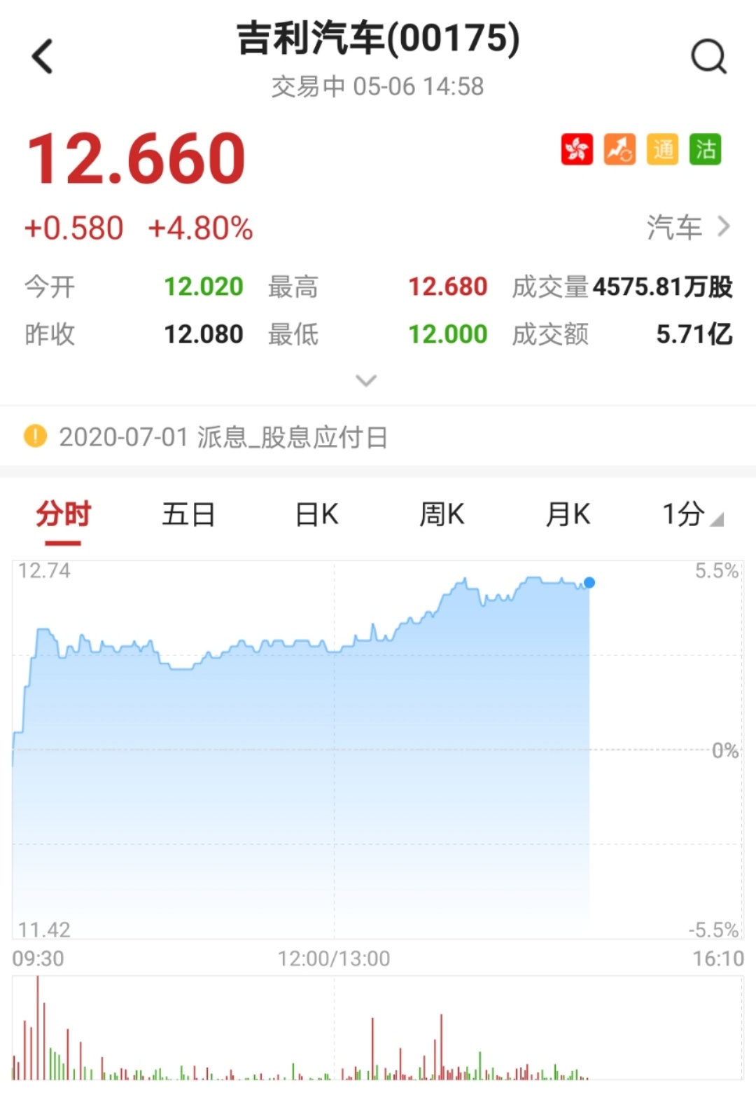 智通财经APP获悉,花旗发布报告,将吉利汽车(00175)目标价升至16.7港元,且列为汽车股首选。该股盘中涨超4%,突破多条均线,创一个月新高,截至14时58分,涨4.8%,报价12.66港元,成交额5.71亿。