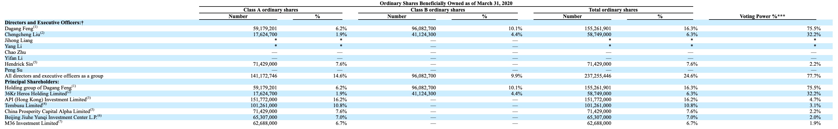 截至2020年3月31日,36氪已发行937,358,520股普通股,其中包括841,275,820股A类普通股及96,082,700股B类普通股。
