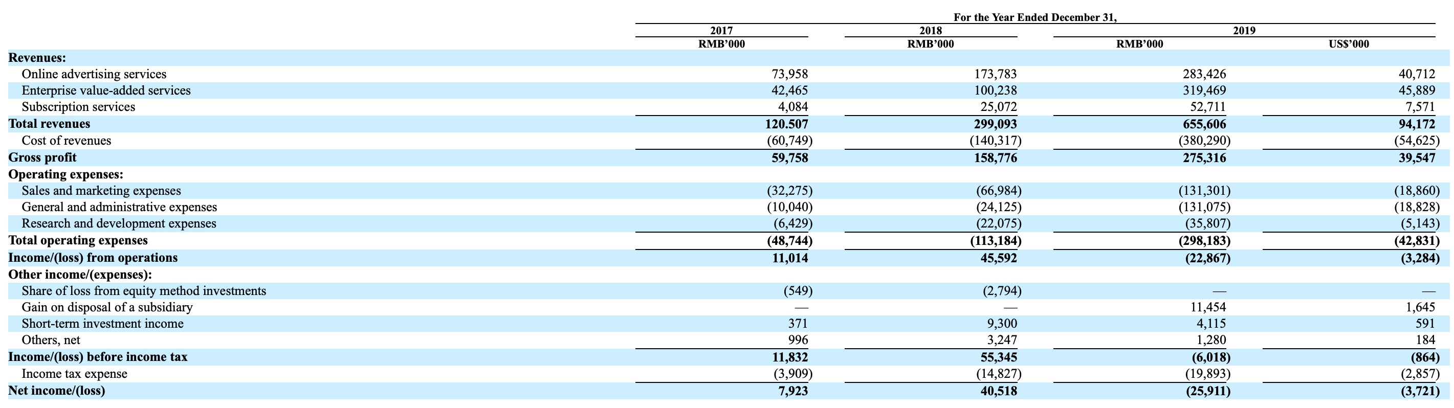 2019年全年,36氪录得营收6.556亿元(人民币,下同),较上年同期增长119.2%。净亏损2591.1万元,2018年净利润4051.8万元。非GAAP调整后净利润为6526万元。每股亏损2.31元,2018年每股亏损0.275元;每ADS亏损57.75元。