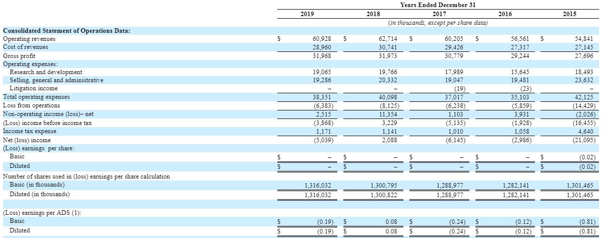 2019年净亏损503.9万美元,摊薄每ADS亏损0.19美元;2018年净利润为208.8万美元,摊薄每ADS收益0.08美元。