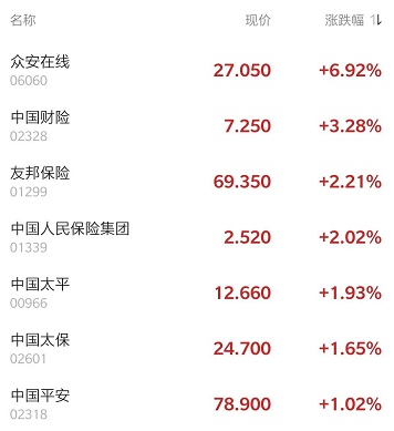 截至发稿,众安在线(06060)涨6.92%,报27.05港元;中国财险涨3.42%,报7.26港元;中国人民保险集团(01339)涨2.02%,报2.52港元;中国太平(00966)涨1.93%,报12.66港元。