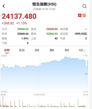 智通财经APP获悉,恒指早盘平开,报23868.02点。截至收盘,恒生指数涨268.82点或1.13%,报24137.48点,全日成交额达1095.92亿。国企指数涨1.13%,报9807.76点,红筹指数涨1.84%,报3809.68点。
