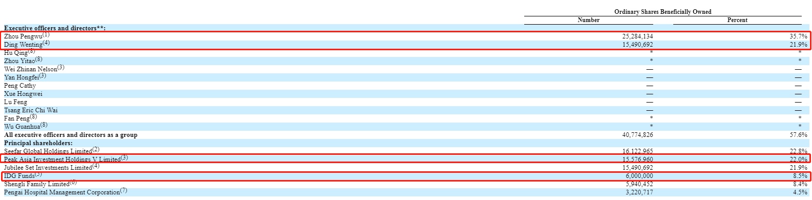 周鹏武共持有医美国际25,284,134股普通股,占总发行股份的35.7%。其中,通过Seefar Global Holdings Limited持有22.8%股份,通过Shengli Family Limited持有8.4%股份,通过Pengai Hospital Management Corporation持有4.5%股份。