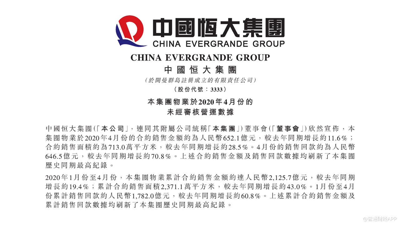 智通财经APP获悉,5月6日,中国恒大(03333)发布公告,4月实现销售652.1亿,同比增长11.6%;销售面积713万平方米,同比增长28.5%;销售回款646.5亿,同比增长70.8%,均创同期历史新高。