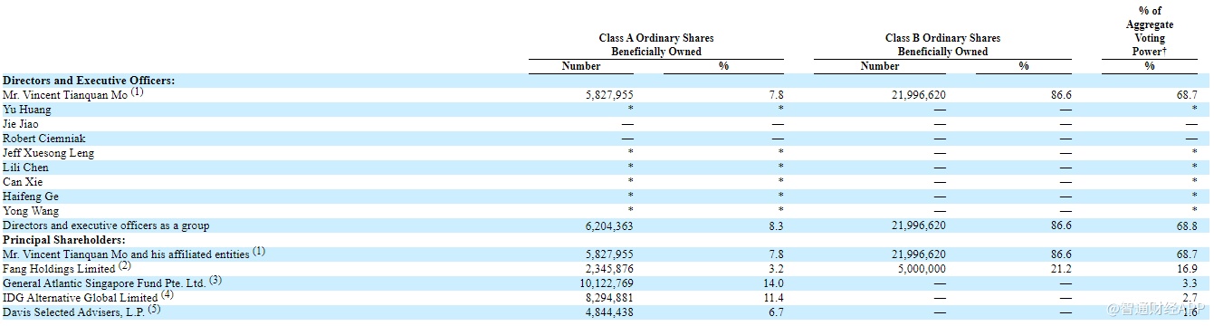 在主要股东名单上,莫天全先生及其附属实体共计持有5,827,955股A类普通股(占所有A类股的7.8%)及21,996,620股B类普通股(占所有B类股的86.6%),拥有68.7%的投票权。