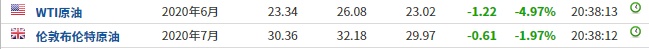 截至发稿,WTI原油跌4.97%,报23.34美元/桶。布伦特原油跌1.97%,报30.36美元/桶。