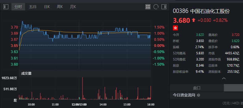 截至今日收盘,中石化涨0.82%,报3.68港元。