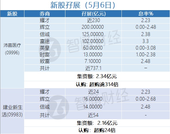 智通财经APP获悉,沛嘉医疗(09996)、建业新生活(09983)正在招股中,截至5月6日,辉立、耀才、信诚等券商分别共为其借出737.1亿港元和近54亿港元,其中沛嘉医疗超购逾314倍。