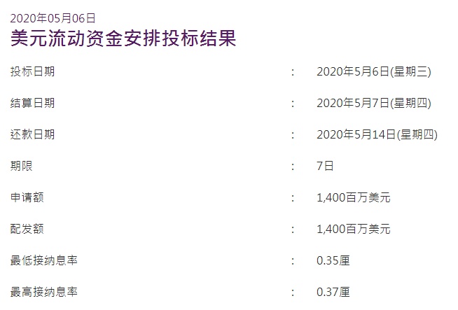 智通财经APP获悉,今日(5月6日),金管局首次根据临时美元流动资金安排进行投标,申请额及配发额均为14亿美元,最低及最高接纳息率分别为0.35及0.37厘,还款日期为5月14日。