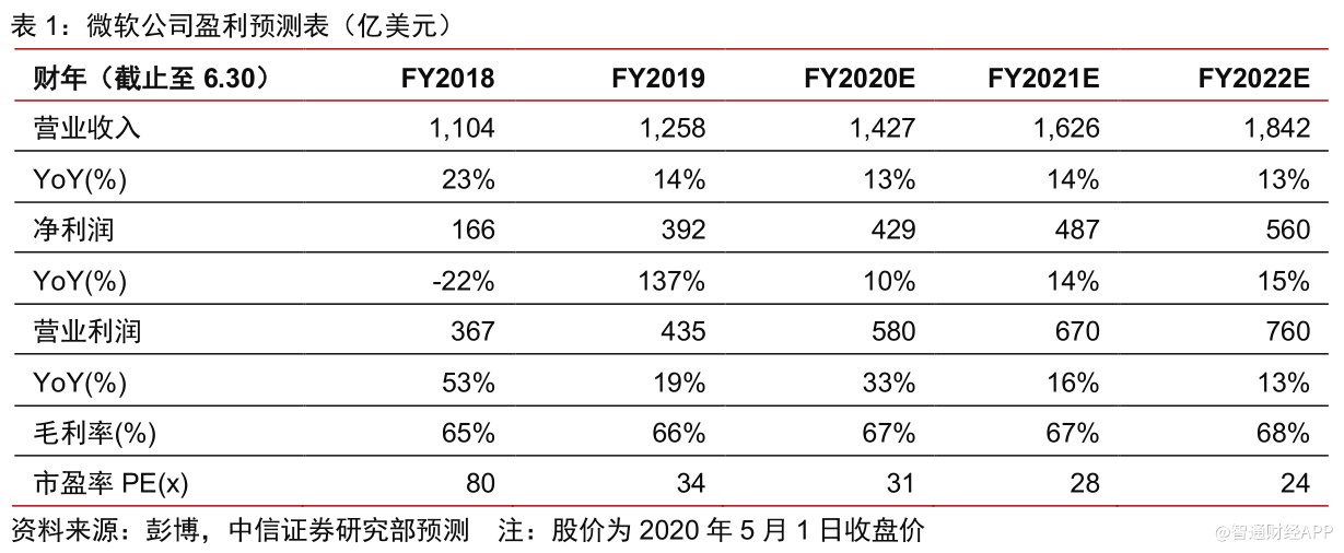 投资建议:公共卫生事件短期对公司的影响整体中性偏正面,长期公司料亦将明显受益于企业云化进程加速。Azure、office、dynamics等云业务依旧是公司中短期成长性和盈利能力改善的主要来源。我们继续维持公司FY2020/21/22年整体营收入为1,439/1,618/1,820亿美元预测,对应增速14%/12%/13%,预测净利润为401/466/537亿美元,对应增速2%/16%/15%的预测。公司当前估值对应FY2020/21/22年PE为33/28/25X,市场对公司估值溢价主要反映公司自身良好的成长性,以及突出的市场竞争地位等。
