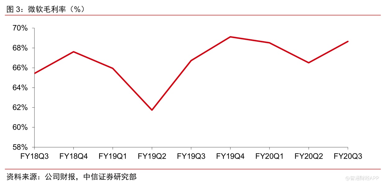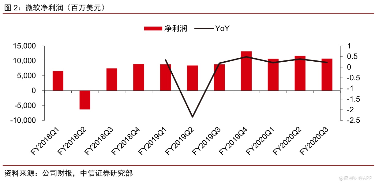 其他业务:整体保持稳健,在线广告受到明显拖累。公司office、Windows等基础软件业务依旧保持稳健,受远程办公增长推动,office移动版、Windows系统需求增长,office商业版、个人版分别增长13%、15%,Windows商业产品及云服务增长17%。而Surface产品终端受居家办公需求刺激增长1%,但受到亚洲供应链影响,抵消了部分增长。内容端,游戏内容受娱乐需求刺激,季度环比大幅改善,Xbox实现1%的增长,XboxLive全球用户突破9000万,XboxGamePass订阅用户突破1000万。而广告业务受公共卫生事件期间广告支出缩减影响仅增长1%,增速环比下滑5pcts。整体看公司其他业务依旧较为稳定。