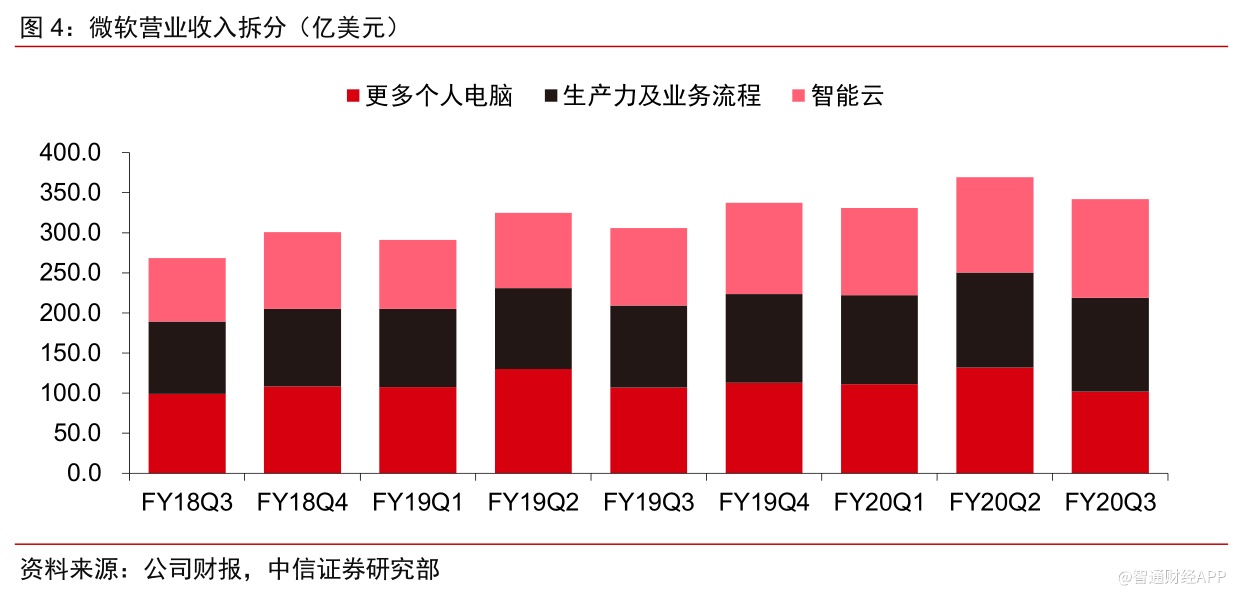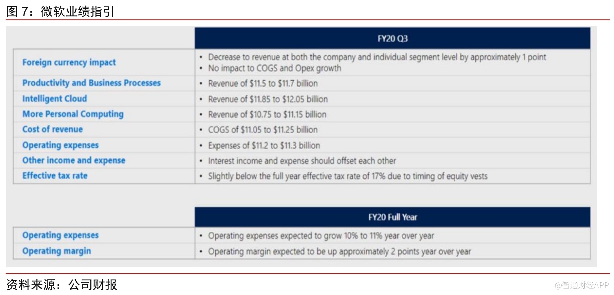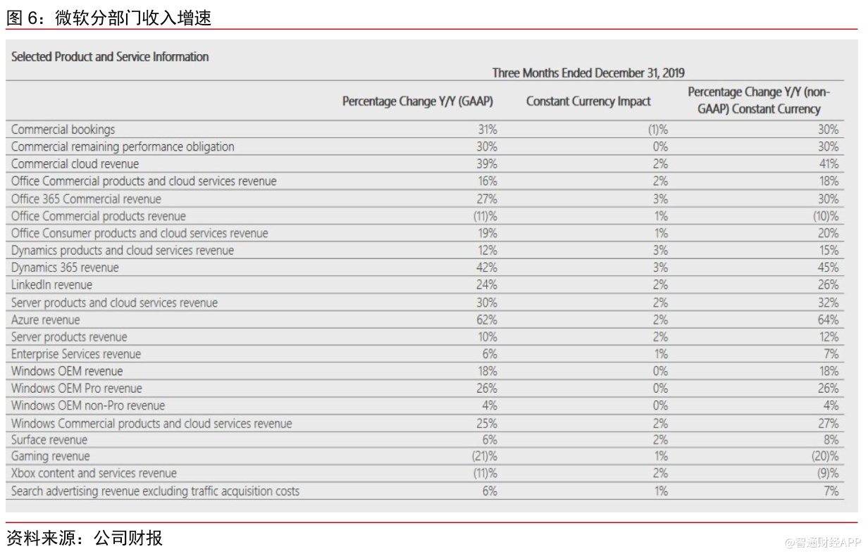业绩表现:整体好于市场预期。当季公司实现营收350亿美元(同比+15%),经营利润130亿美元(同比+25%),调整后净利润108亿美元(同比+22%),均略高于市场预期,其中生产力与商业流程业务部门收入117亿美元(同比+15%),智能云业务部门收入123亿美元(同比+27%),个人计算业务部门为102亿美元(+3%)。受公共卫生事件影响,公司部分业务增长明显,包括office365、Azure、windowsOEM、surface、游戏等,但同时在线搜索、Linkedin等业务广告收入则受到明显影响,整体而言,公司受公共卫生事件影响显著小于一般科技企业。