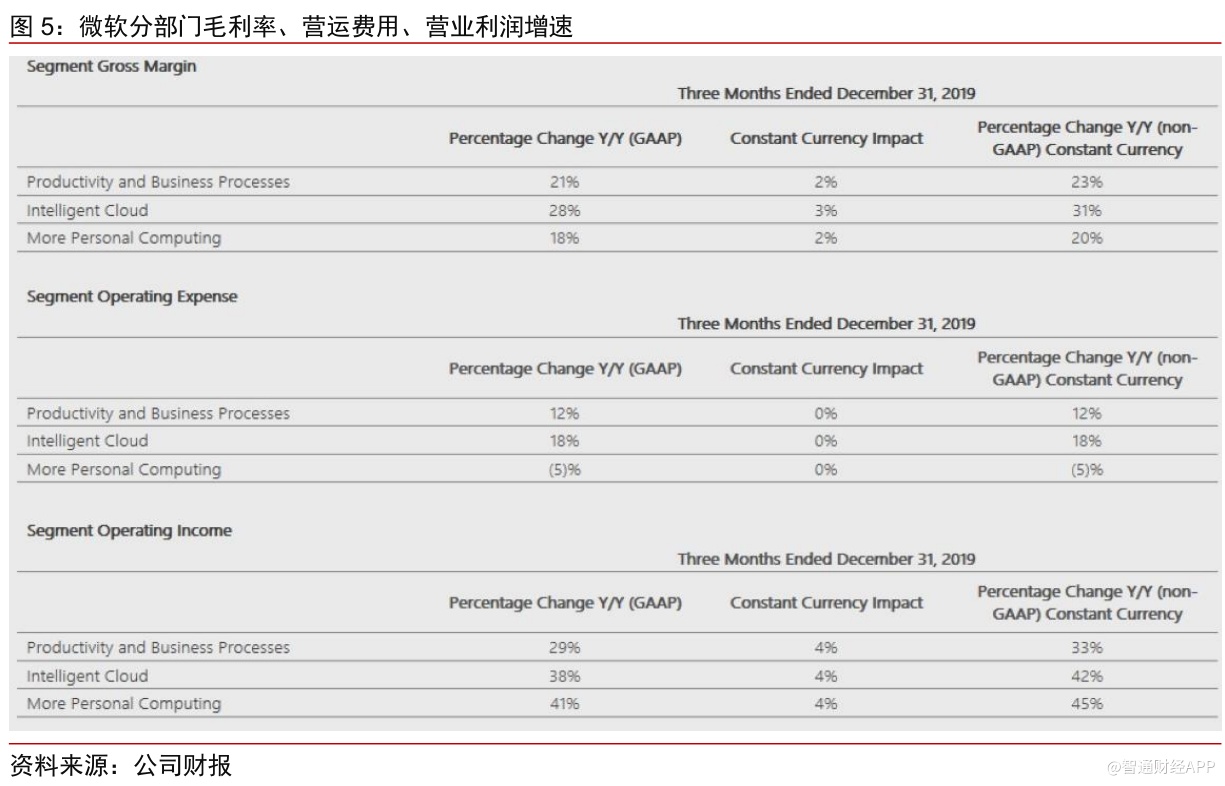 部门毛利增长30%,按固定汇率计算增长32%,毛利率同比增长2个百分点,因为Azure毛利率继续提高,足以抵消AzureIaaS和PaaS收入组合增长的影响。营业支出增长了19%,这主要由于对Azure的持续投资。营业利润增长了42%,以固定汇率计算则增长了46%。