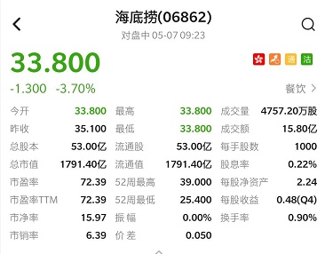 智通财经APP获悉,海底捞(06862)公布,股东SP NP Ltd.及LHY NP Ltd.拟以每股33.2港元的价格配售4700万股股份,较昨日收市价35.1港元折价5.42%。海底捞市前现两宗大手成交,或为该配售上板。截至发稿,海底捞跌3.7%,报33.8港元,成交额15.8亿港元。