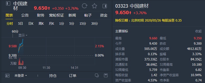 该行表示,一周前在网上会议讨论,重点关注水泥虽然不是行业的必须原材料,但是行业的高估值已经恢复到公共卫生事件发生前的水平。该行对中国建材非常谨慎,忧虑与行业领导者包括海螺水泥(00914)及华润水泥(01313)相比,中国建材首季的收入较弱。现时,疲弱的首季即将过去,由三位管理层确认,该行业前景强劲。该行认为,2020年余下时间中国建材将摆脱对首季度疲软的担忧,市场关注资产负债表持续改善带来的收益,更重要的是估值便宜。
