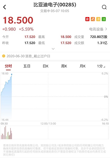 智通财经APP获悉,中信证券发布研报称,比亚迪电子(00285)一季度净利润6.6亿元,同比增加69.44%,上半年业绩预告净利润同比增速不低于280%,大超市场预期。公司手机零部件及组装主业在各大客户份额持续提升,盈利状况显著好转。口罩业务订单可见度较高,预计收入及利润贡献显著。该行上调其目标价至21港元,维持“买入”评级。截至发稿,比亚迪电子涨5.02%,报18.4港元,成交额1.24亿港元。