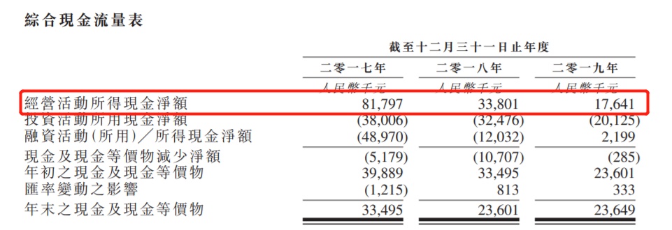 公司称,截至2018年末公司经营活动所得现金净额减少主要是由于(i) 按公平值计入损益的金融资产增加;(ii)存货增加,此主要是由于塬材料增加;及(iii)贸易及其他应收款项增加。截至2019年末,经营活动所得现金净额进一步减少至约人民币17.6百万元,主要是由于(i)贸易及其他应付款项减少;(ii)存货增加,此主要是由于塬材料增加;及(iii)已付所得税增加。