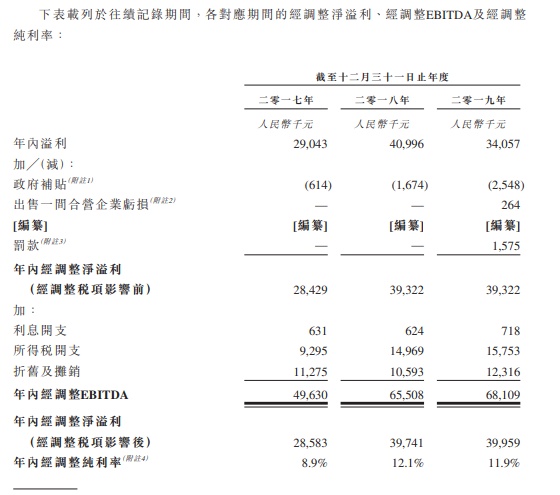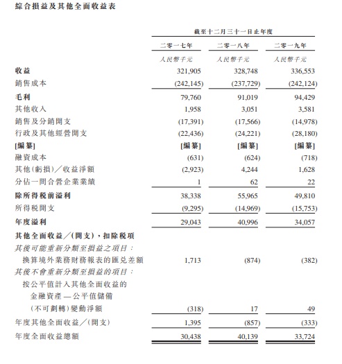 2017-2019财政年度,公司收益分别为3.21亿元,3.29亿元,3.37亿元;收益增加的同时,毛利也在逐步上升,2017-2019财政年度,公司毛利分别为7976万元,9102万元,9443万元,年内溢利分别为2904万元,4099万元,3406万元。
