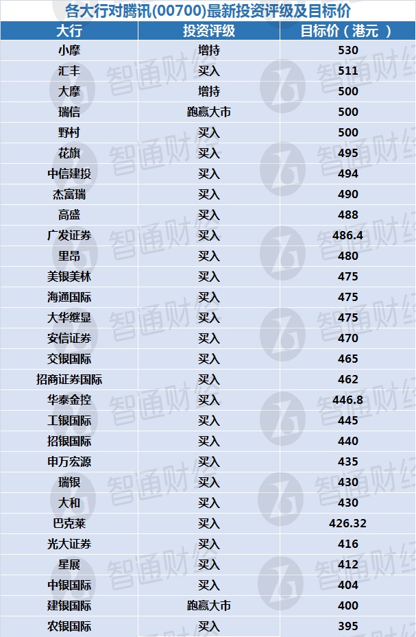 以下列车各大行对腾讯(00700)最新投资评级及目标价: