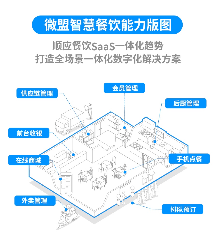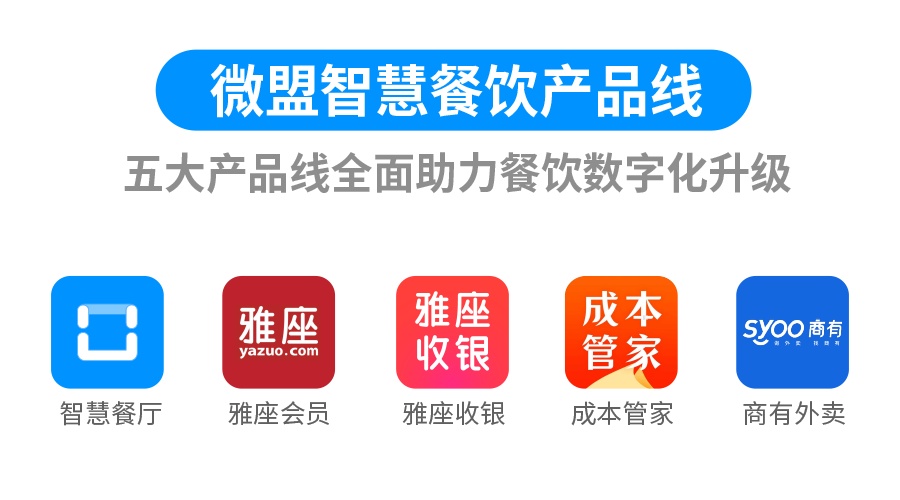 微盟智慧餐饮公司将下设销售中心、运营服务中心、产品研发中心、收银POS事业部以及成本管家事业部五大部门,目前拥有智慧餐厅、雅座收银、雅座会员、成本管家和商有外卖五大业务线,形成集会员、收银、外卖、商城、点餐、预订、供应链管理为一体的全场景一体化数字化解决方案。