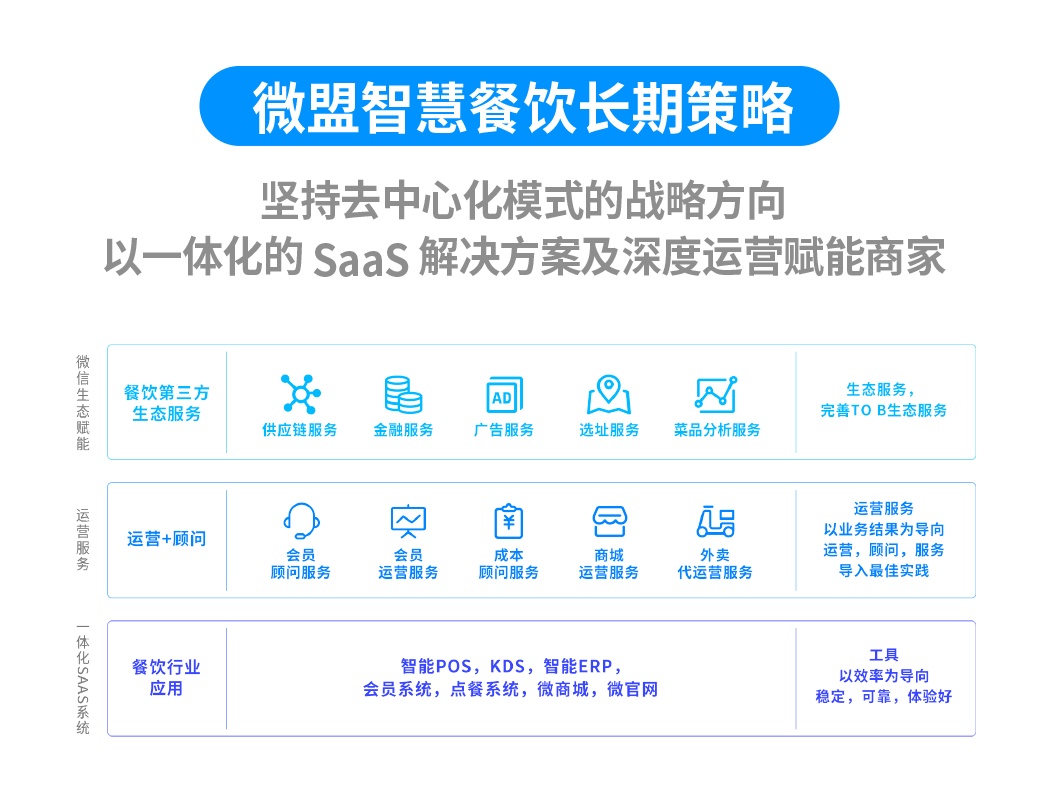智慧餐饮是微盟智慧商业生态布局中的极为重要的一块拼图,也是微盟SaaS业务接下来重点发力的方向之一。此次微盟成立智慧餐饮公司,通过将微盟原有的智慧餐饮解决方案与雅座、商有的多方资源进行全盘整合,重新调整管理构架和细分五大产品体系,形成一站式全场景数字化解决方案,将进一步提升微盟智慧餐饮的综合实力和行业竞争力,业务发展有望提速。据悉,微盟智慧餐饮的愿景是“数字餐饮”。“智慧生活”,以领先的数字技术和专业的顾问服务,助力餐饮企业向数字化转型升级为使命。新调整后的微盟智慧餐饮五大业务线将全面覆盖头部、腰部及中长尾餐饮商户需求,全方位助力餐饮商户数字化升级。