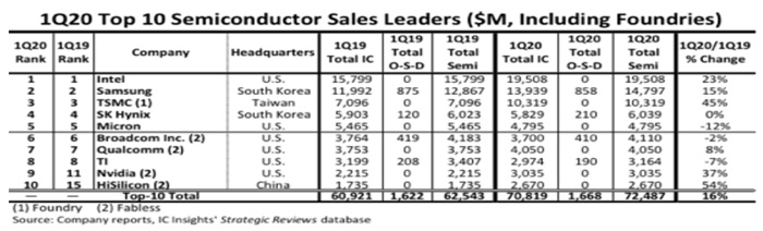 从发布的榜单中看出,华为海思相较去年上升了5位,挤掉英飞凌和东芝。华为海思相较去年上升了5位,挤掉英飞凌和东芝。而在第一季度中,收入排名前十中另外九家企业分别为,英特尔(INTS.US)、三星、台积电(TSM.US)、SK海力士、美光(MU.US)、博通(AVGO.US)、高通(QCOM.US)、德州仪器(TXN.US)和英伟达(NVDA.US),其中收入最高的英特尔为195.08亿元,而排名前三的企业销售额全部超过了100亿美元。