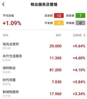 截至14时56分,佳兆业美好涨9.64%,报价29港元,永生生活服务(01995)涨4.6%,保利物业(06049)涨4.1%,时代邻里(09928)涨3.84%,新城悦服务(01755)涨3.34%。