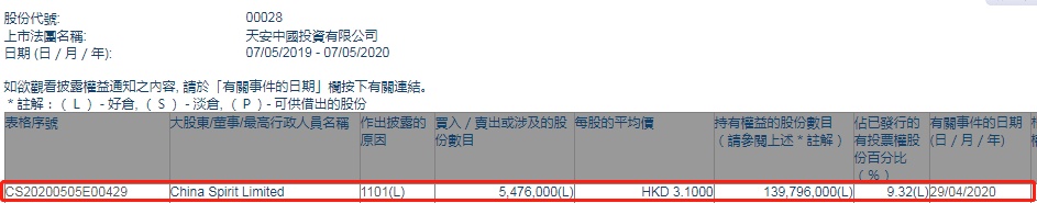 智通财经APP获悉,联交所最新资料显示,4月29日,China Spirit Limited增持天安(00028)547.6万股,每股作价3.1港元,总金额约为1697.56万港元。增持后最新持股数目约为1.40亿股,最新持股比例为9.32%。