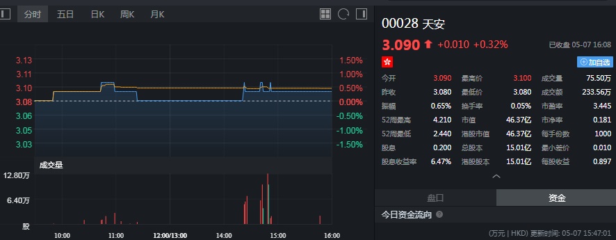 截至今日收盘,天安涨0.32%,报3.09港元。