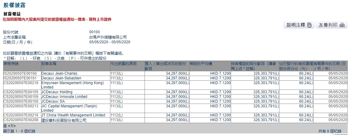 智通财经APP获悉,联交所最新资料显示,5月5日,建投华科投资公司增持白马户外媒体(00100)3429.7万股,每股作价7.12港元,总金额约为2.44亿港元。增持后最新持股数目约为3.26亿股,最新持股比例为60.24%。