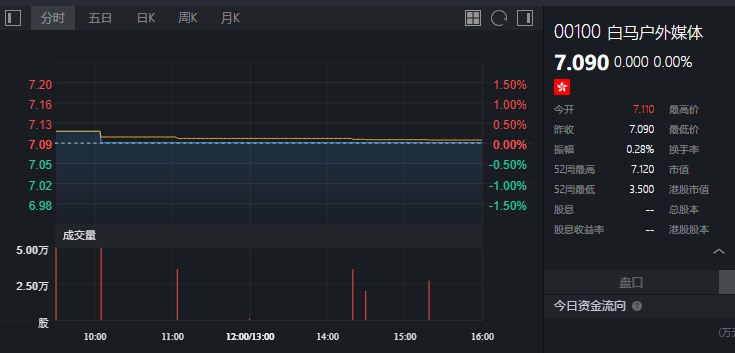 截至今日收盘,白马户外媒体无涨跌,报7.09港元。