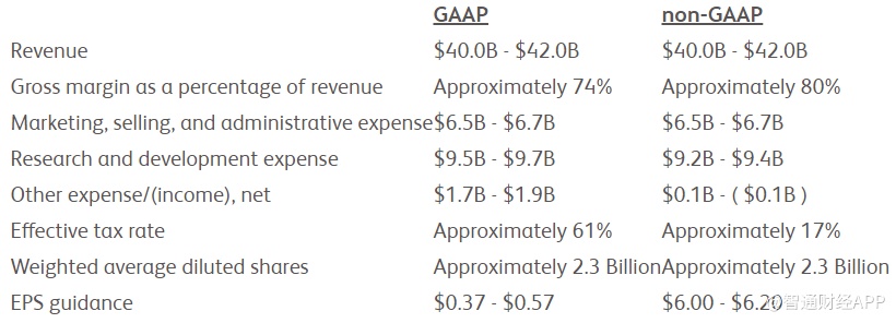 展望2020全年,公司预计GAAP营收在400亿至420亿美元之间,GAAP每股收益在0.37美元至0.57美元之间(此前为0.75美元至0.95美元);预计non-GAAP每股收益在6美元至6.2美元之间。