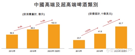 GlobalData数据显示,按消费量计算,中国高端及超高端啤酒消费量在2023年将达到102亿升,2018年以来的复合年均增长率为4.9%;按价值计,2023年中国高端及超高端啤酒消费量将达到627亿美元,2018年以来年均复合增长达到8.5%,远高于消费量增长速度。