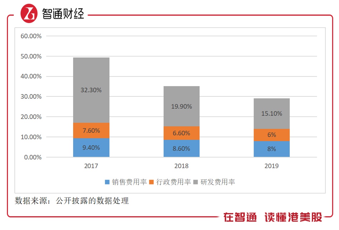 该公司的三大运营费用,即销售费用率、行政费用率及研发费用率均处于下降趋势,核心费用为研发费用率,2019年为15.1%,较2017年下降了17.2个百分点,三项费用率合计为29.1%,较2017年下降了20.2个百分点。该公司目前客户集中度较高,且具有一定的稳定性,在规模效益下,销售及行政费用率仍有进一步下降的空间。