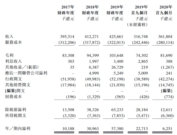 截至2019年3月31日止三个年度各年,公司分别产生收入约3.96亿港元、4.12亿港元、4.26亿港元。同期,公司年内溢利分别为1018.8万港元、3096.3万港元、5738万港元。于往绩记录期间,公司的大部分收入来自物业管理服务。