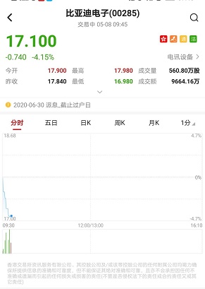 智通财经APP获悉,比亚迪电子(00285)早盘高位回落,一度挫逾4%跌破10日均线,截至9时45分,跌4.15%,报价17.1港元,成交额9664.16万。