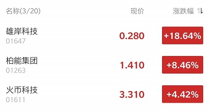 截至发稿,雄岸科技(01647)涨16.53%,报0.275港元;柏能集团(01263)涨8.46%,报1.41港元;火币科技(01611)涨4.42%,报3.31港元。