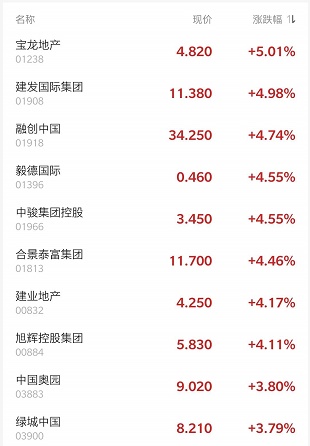 截至发稿,宝龙地产(01238)涨5.01%,报4.82港元;融创中国(01918)涨4.59%,报34.2港元;合景泰富集团(01813)涨4.29%,报11.68港元;中国奥园(03883)涨3.8%,报9.02港元。