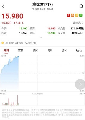 智通财经APP获悉,澳优(01717)直线拉涨逾5%,盘中以16.08港元,刷新10个月新高,截至10时44分,涨5.41%,报价15.98港元,成交额4270.48万。