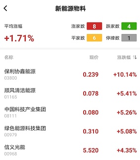 智通财经APP获悉,5省发布可再生能源补贴名单,光伏太阳能板块集体走强,截至11时38分,保利协鑫能源(03800)涨10.14%,报价0.239港元,顺风清洁能源(01165)涨5.41%,信义光能(00968)涨4.35%。