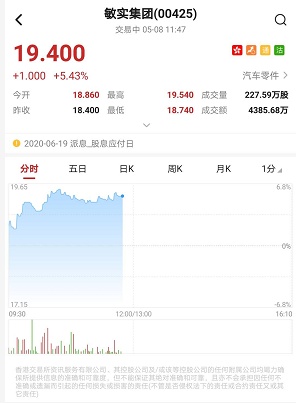智通财经APP获悉,敏实集团(00425)于5月6日发布公告,附属向嘉兴富廷采购资产并租赁浙江工厂,截至11时47分,涨5.43%,报价19.4港元,成交额4385.68万。