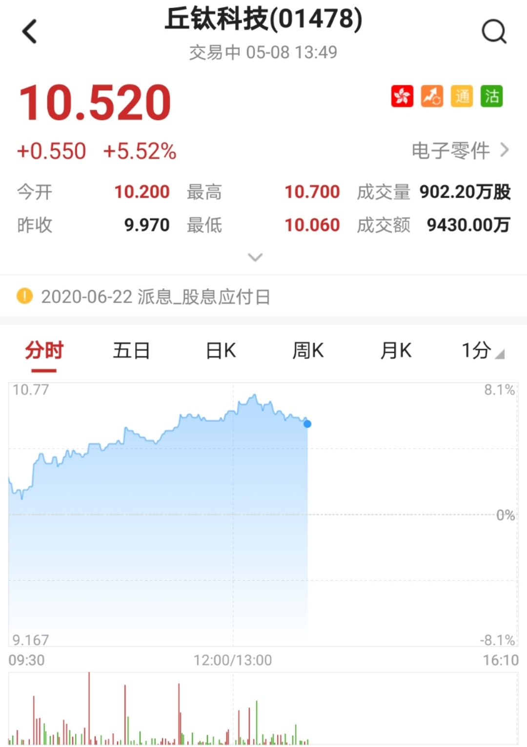 智通财经APP获悉,手机产业链升势延续,丘钛科技(01478)领涨板块,盘中一度涨超7%,突破多条均线,创一个月新高。截至13时49分,丘钛科技涨5.52%,报价10.52港元,瑞声科技(02018)涨3.86%,舜宇光学科技(02382)涨3.19%,通达集团(00698)涨1.96%。