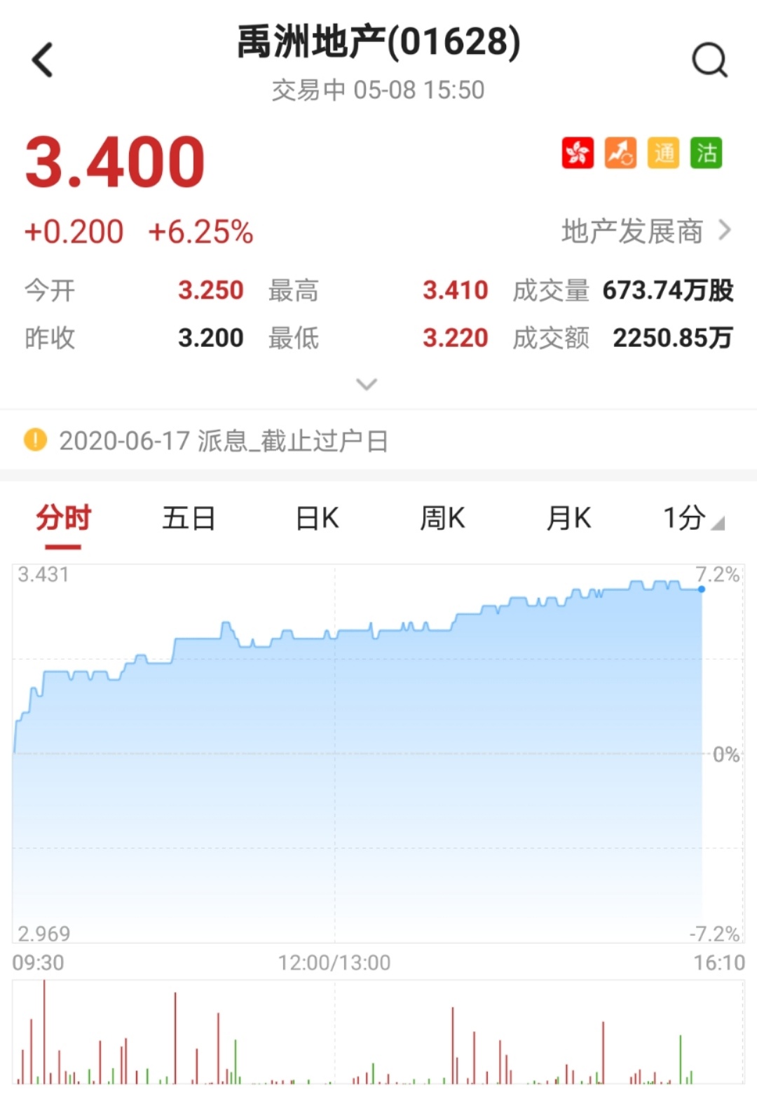 该股尾盘涨超6%,突破多条均线,创一个月新高。截至15时50分,涨6.25%,报价3.4港元,成交额2250.85万。