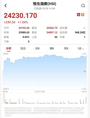 智通财经APP获悉,恒指早盘高开212.73点或0.89%,报24193.36点。截至收盘,恒生指数涨249.54点或1.04%,报24230.17点,全日成交额达968.2亿。国企指数涨1.07%,报9868.34点,红筹指数涨1.2%,报3823.64点。