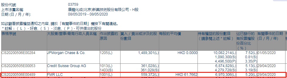 智通财经APP获悉,联交所最新资料显示,4月29日,FMR LLC增持康龙化成(03759)55.9372万股,每股作价61.7662港元,总金额约为3455.03万港元。增持后最新持股数目约为697.03万股,最新持股比例为5.20%。