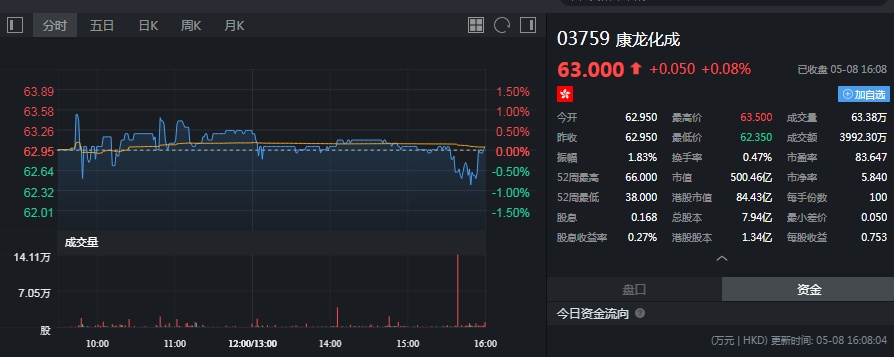 截至今日收盘,康龙化成涨0.08%,报63港元。