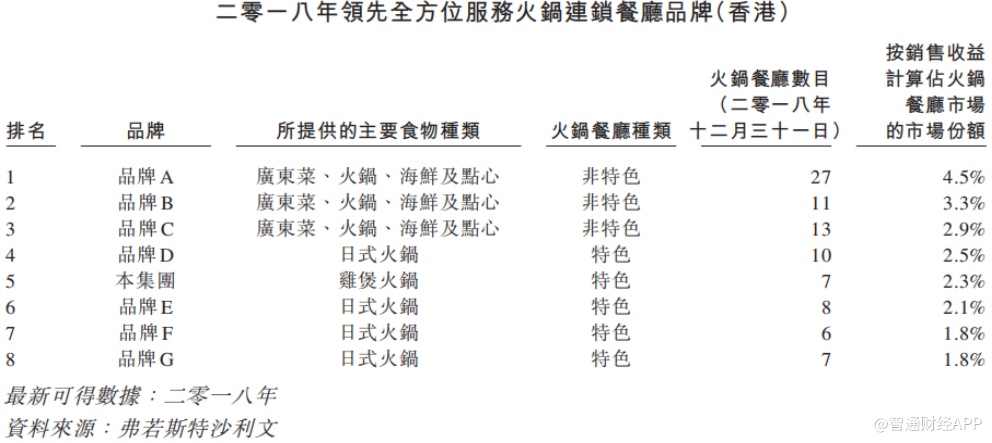 根据弗若斯特沙利文报告,一品发展在香港一般火锅餐厅市场排名第五位,市场占有率约为2.3%;按2018年的销售收益计算,公司在香港特色火锅餐厅市场排名第二位。