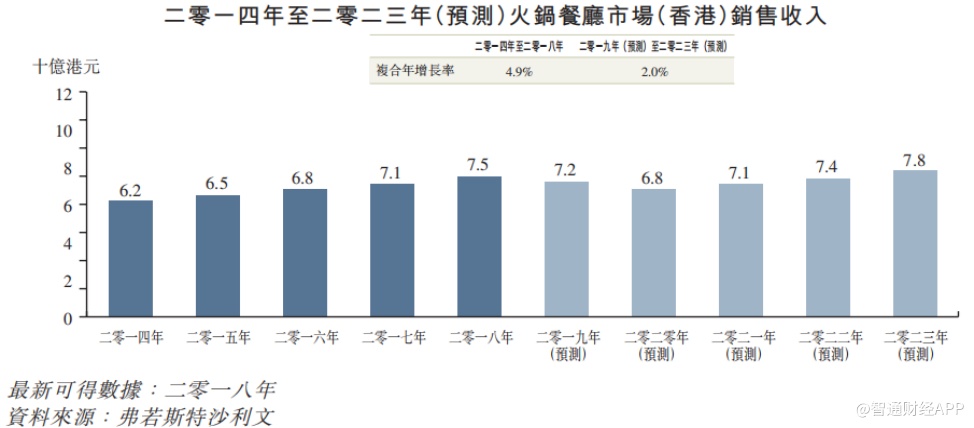 竞争压力较大的同时,行业发展空间也较为有限。据弗若斯特沙利文报告,香港火锅店的收入由2014年约62亿港元(单位下同)增至2018年约75亿元,复合年增长率约为4.9%。2018年至2023年,香港火锅店的市场规模年均复合增长率将下降至2%,到2023年市场规模为78亿元。