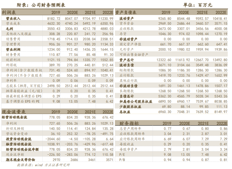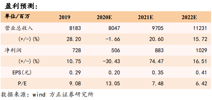我们预计2020/2021/2022年公司归母净利润分别为5.06/8.83/10.29亿元,同比增速在-30.43%/74.47%/16.51%,对应EPS为0.20/0.35/0.41元/股,对应P/E为13/7/6,维持“推荐”评级。